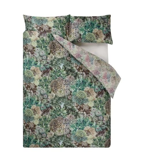 Le modèle Madhya, en satin de coton, propose une abondante source de verdure, détaillée de nombreuses feuilles et feuillages verdoyants dans de riches tons d'émeraudes, de mousse et d'azur. Le modèle est réversible selon votre choix. Le verso dévoilera une délicate superposition de feuilles, le tout fini d'un ruban texturé lin.