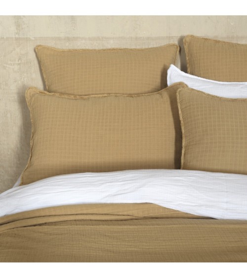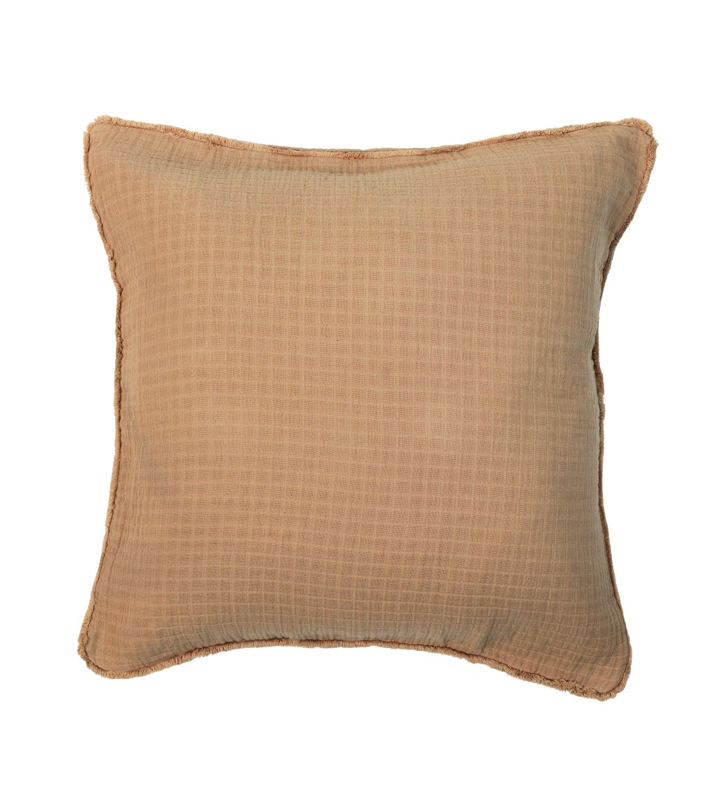 Housse de coussin Minorque en gaze de coton camel avec son motif quadrillé et ses bords frangés.