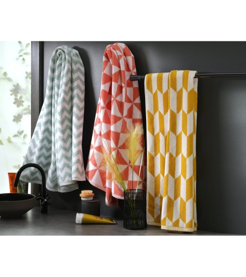 Enveloppez-vous dans ce doux et moelleux drap de bain jaune 70x140 en coton. Craquez pour cette drap de bain 70 x 140 cm aux motifs géométriques. Du linge de toilette conçu dans un pur coton 450g/m2, lavable à 60°, une éponge bouclette qualitative à la qualité d'absorption indéniable !