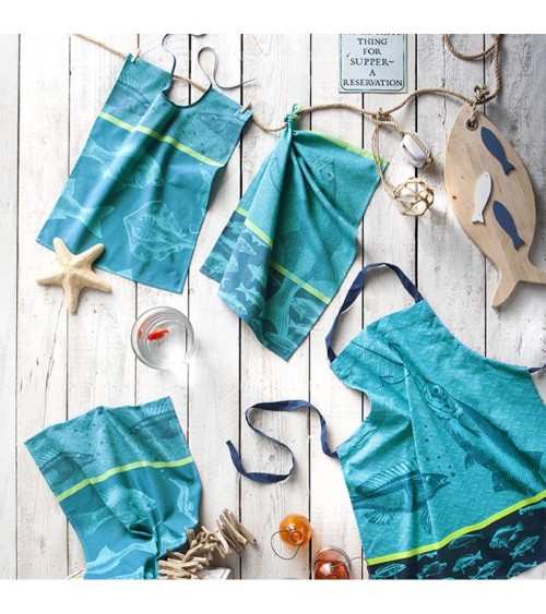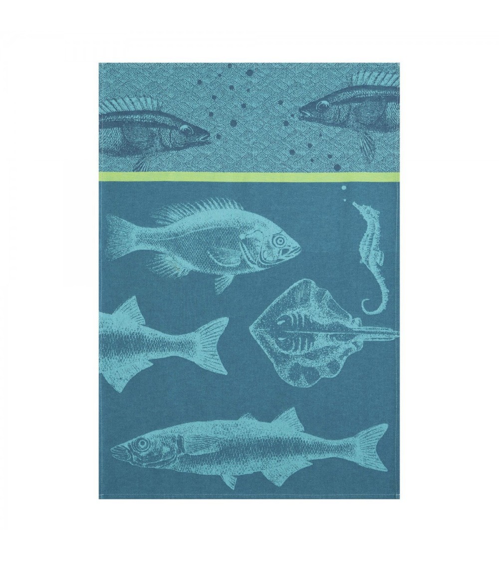 Torchon de cuisine bleu en coton imprimé, orné de banc poissons.
