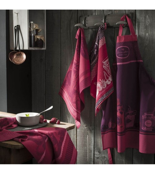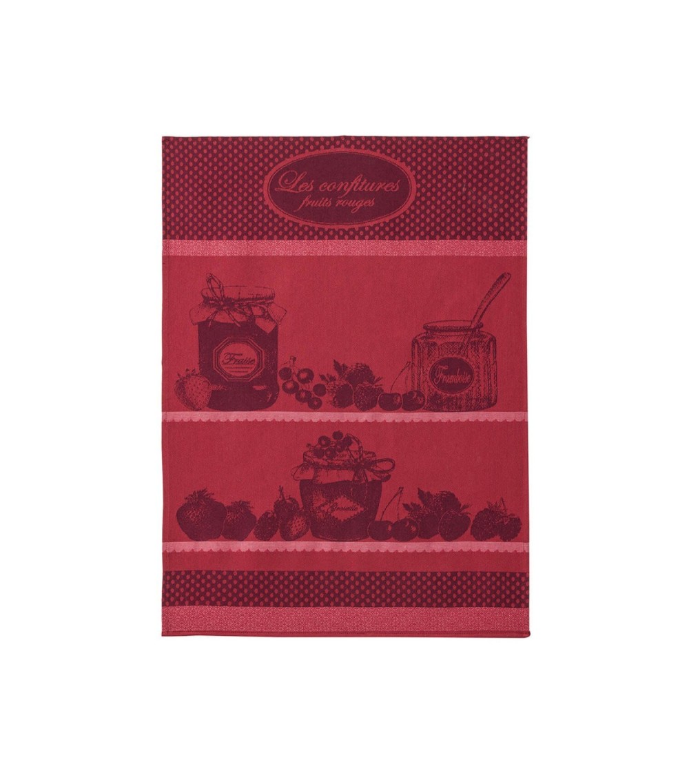 La nouvelle série de torchons ''Confitures'' fait appelle à nos souvenirs d'enfance en nous rappelant les doux moments passés en cuisine avec notre maman ou grand-maman à confectionner des confitures pour régaler toute la famille. Le torchon CONFITURE FRUITS ROUGES représente des pots de confiture entreposés sur une étagère avec les fruits rouges qui ont servi à la confection. Ils n'attendent plus qu'à être dégusté ! A l'image de la représentation, le torchon reprend les coloris rouge de ces petites douceurs sucrées.