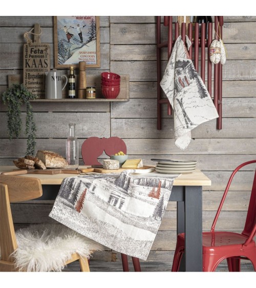 Ce chalet perdu dans la montagne nous évoque la tranquillité du paysage. Il ne reste qu'à vous imaginer chausser les skis pour dévaler les pistes au gré de vos envies. Laissez-vous séduire par la tendance noire et blanche des cuisines contemporaines ou ce torchon en 100% lin imprimé trouvera sa place.
