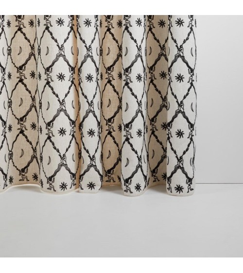 Filippa nous propose une réinterprétation du zodiac. Les personnages et éléments forment un croisillon graphique en noir et blanc. Les astres sont au centre de cet univers. Faune, flore, pluie détoiles sentrecroisent autour de personnages mystérieux. Prêtresse, divinité, toutes les interprétations sont possibles. La broderie au point de chaînette a été choisie pour dessiner chaque élément car elle permet de réaliser des détails avec beaucoup de précision. À associer avec la parure de lit pour accessoiriser ou à poser sur un canapé.