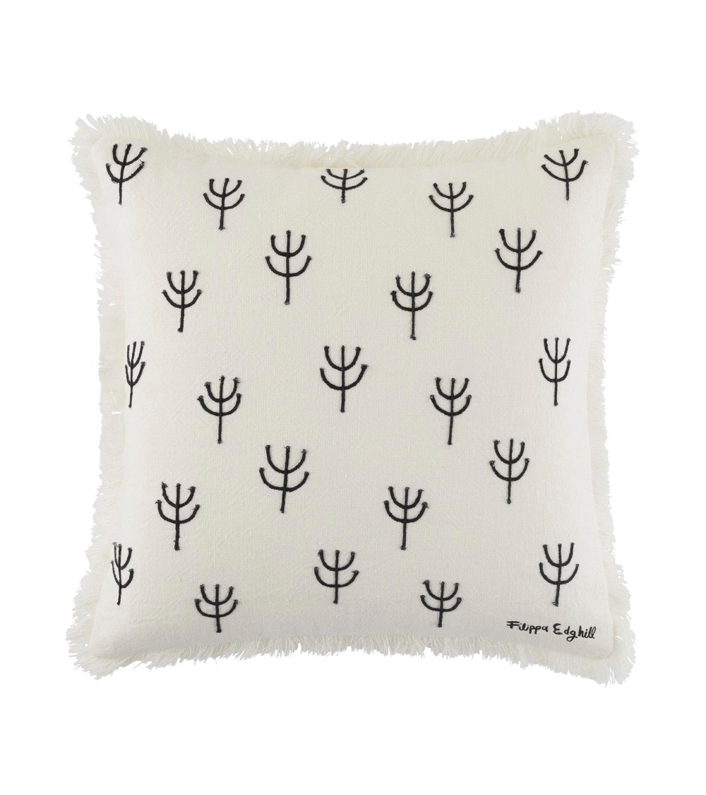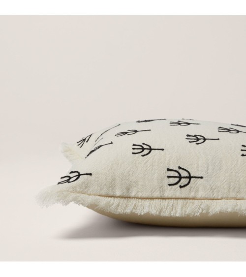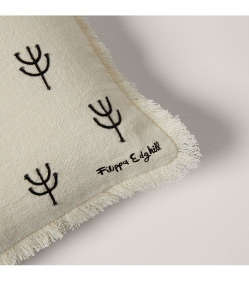 Le motif Sierra symbolise une chaîne de montagne simplifiée à son essence pure. Cest limage dune nature poétique et simple. Sur une base tout en lin, de petits arbres sont délicatement brodés de manière aléatoire à limage de la nature. Chaque motif est brodé avec la technique du point lancé. De jolies franges fournies et courtes viennent habiller les quatre côtés de la housse, comme un feuillage.