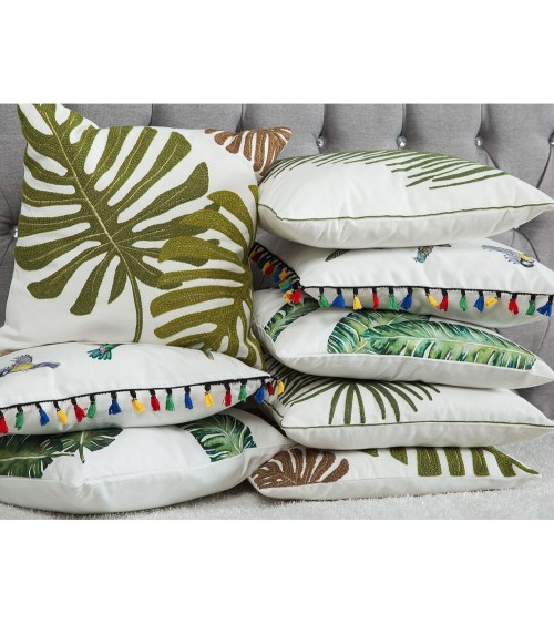 2 coussins décoratifs blancs avec motif feuilles de palmier vertes. Évoquez une touche d'exotisme à votre déco avec ces coussins décoratifs au motif jungle en coton. Le fond blanc et les feuilles de palmier en couleur verte sintégreront parfaitement dans un esprit contemporain. Posés au creux dun fauteuil ou sur un canapé ces jolis coussins sauront apporter une touche finale à votre déco.Détails: Type de produit: Coussin décoratif Style: Moderne Couleur principale: Vert Nuance: Vert foncé Type de matière: Tissu Matière principale: Polyester Matière du rembourrage: Polyester Composition de la matière: 100% Polyester Forme: Carré Fabriqué à la main: Non Motif: Motif de feuille Dimensions: Profondeur: 45 cm Largeur: 45 cm Hauteur: 12 cm Poids du rembourrage: 350 kg Poids: 0.6 kg L`offre inclue: 2 x Oreiller Caractéristiques clés: Crée une ambiance agréable, Décoratif et fonctionnel, Matières robustes faciles à entretenir, Housses amovibles Informations d`assemblage: Ne nécessite pas d'assemblage Informations supplémentaires: Le coussin est scellé sous vide pour le transport. Veuillez retirer le coussin de l'emballage et le laisser reposer pendant 24 heures jusqu'à ce qu'il atteigne sa pleine densité. Conseils de maintenance: Polyester: 1.Ne pas sécher en machine et ne pas repasser 2.Lavez à la main ou sélectionnez un cycle de lavage délicat (30 °C). Suivez en premier lieu les instructions du fabricant sur l'étiquette.