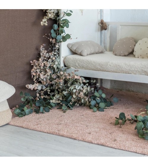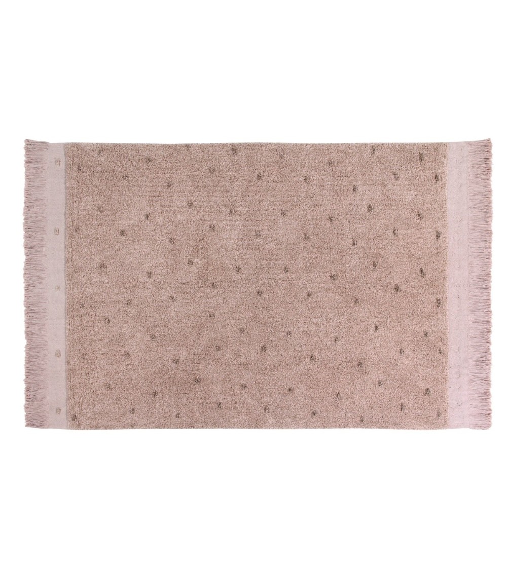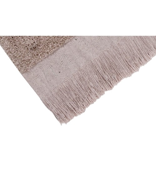 Tapis rectangulaire en coton à petits pois de couleur mélangée Vintage Nude et Soil Brown simulant l'herbe, sur une base en coton Vintage Nude / Linen. Base en toile mélangée Vintage Nude et Soil Brown, visible sur les bords et suivie de franges de la même couleur. Des points sur l'un des bords et sur l'autre une phrase en broderie : Le coton chante des bois.