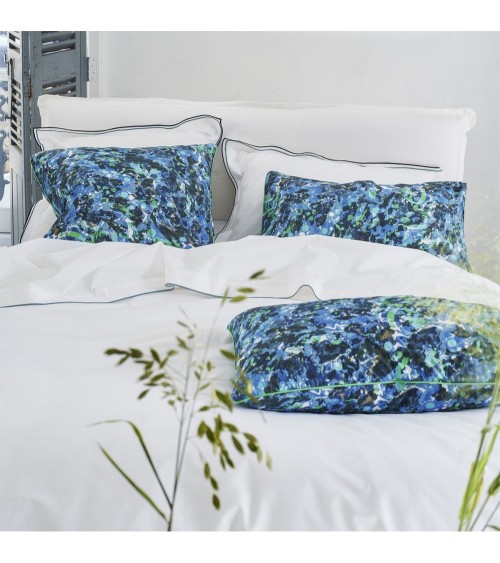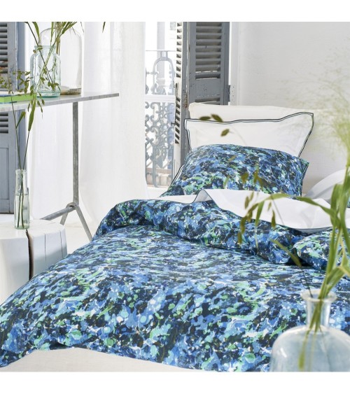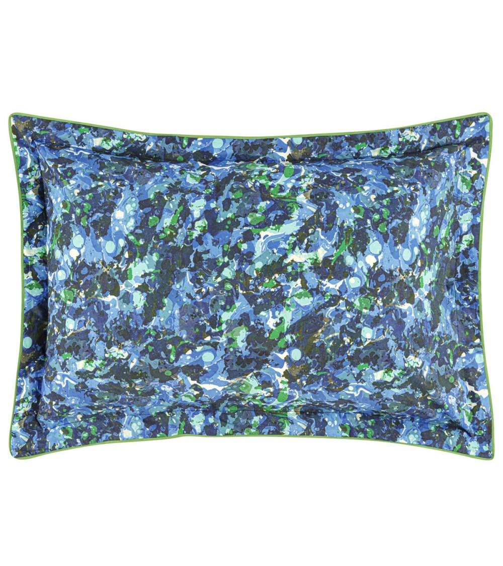 Inspirée des méthodes de marbrure artisanales, ce modèle imprimé numériquement dans de sublimes nuances de bleu cobalt et d'indigo est soulignée par de douces touches d'émeuraude et de jade.