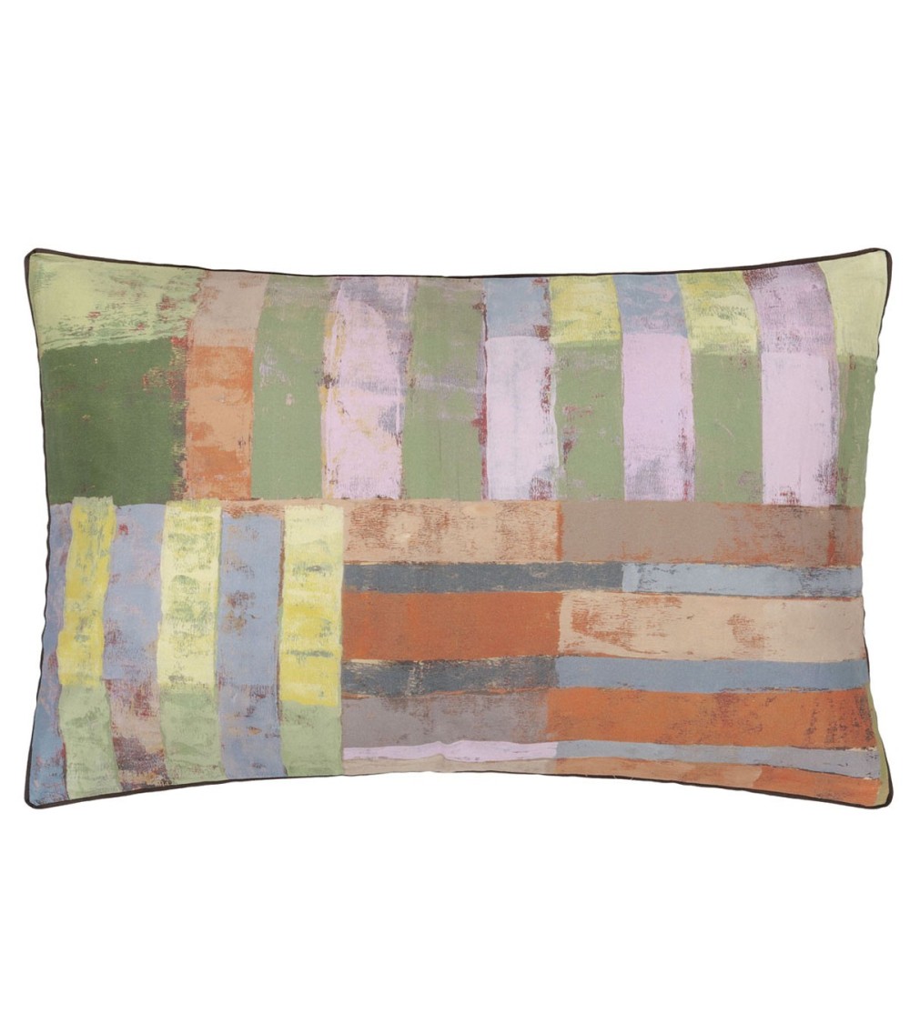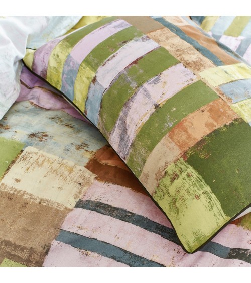 Cette conception de linge de lit tendance présente un rendu graphique de formes picturales texturées dans des tons chauds d'ocre, de rose et de mousse.