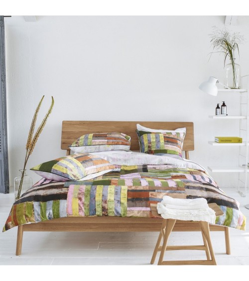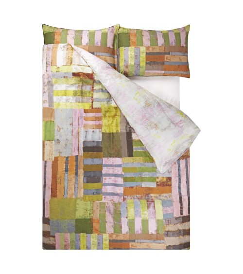 Cette conception de linge de lit tendance présente un rendu graphique de formes picturales texturées dans des tons chauds d'ocre, de rose et de mousse.