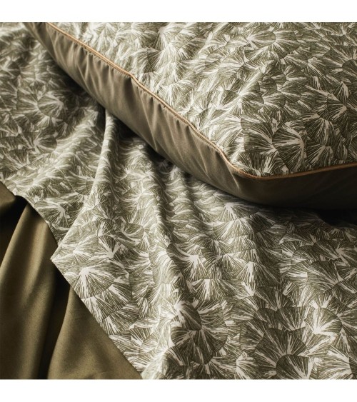 Osmose est un modèle intemporel, orné de palmes épurées. Adoptez cette couleur tendance dans votre chambre, un sublime kaki avec un passepoil lumineux sur les taies d'oreiller qui rappelle le laiton