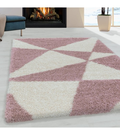 TRIANGLE - Tapis à poils longs et motifs Géométrique - Rose et Blanc Style: SHAGGY Géométrique Forme: Rectangle Couleur: Rose et Blanc Hauteur: 30mm Matériaux: 100% Polypropylène Entretien: Nettoyage Facile, aspirateur et chiffon humide Eco-responsable - Label OEKO-TEX 100
