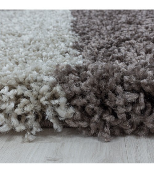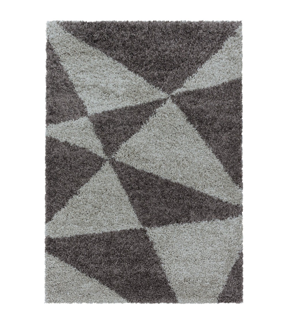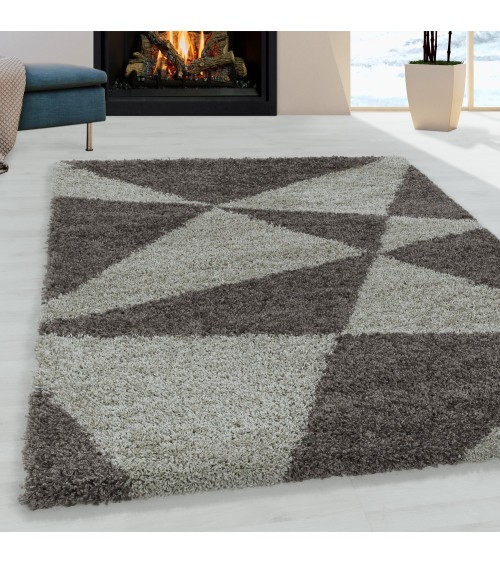TRIANGLE - Tapis à poils longs et motifs Géométrique - Taupe et Gris Style: SHAGGY Géométrique Forme: Rectangle Couleur: Taupe et Gris Hauteur: 30mm Matériaux: 100% Polypropylène Entretien: Nettoyage Facile, aspirateur et chiffon humide Eco-responsable - Label OEKO-TEX 100