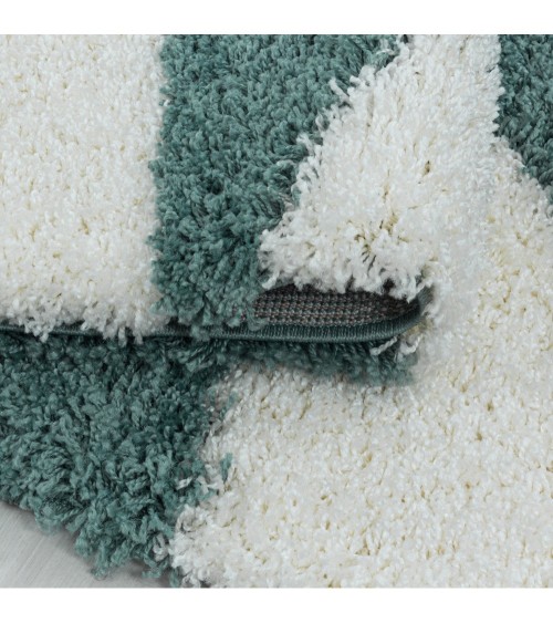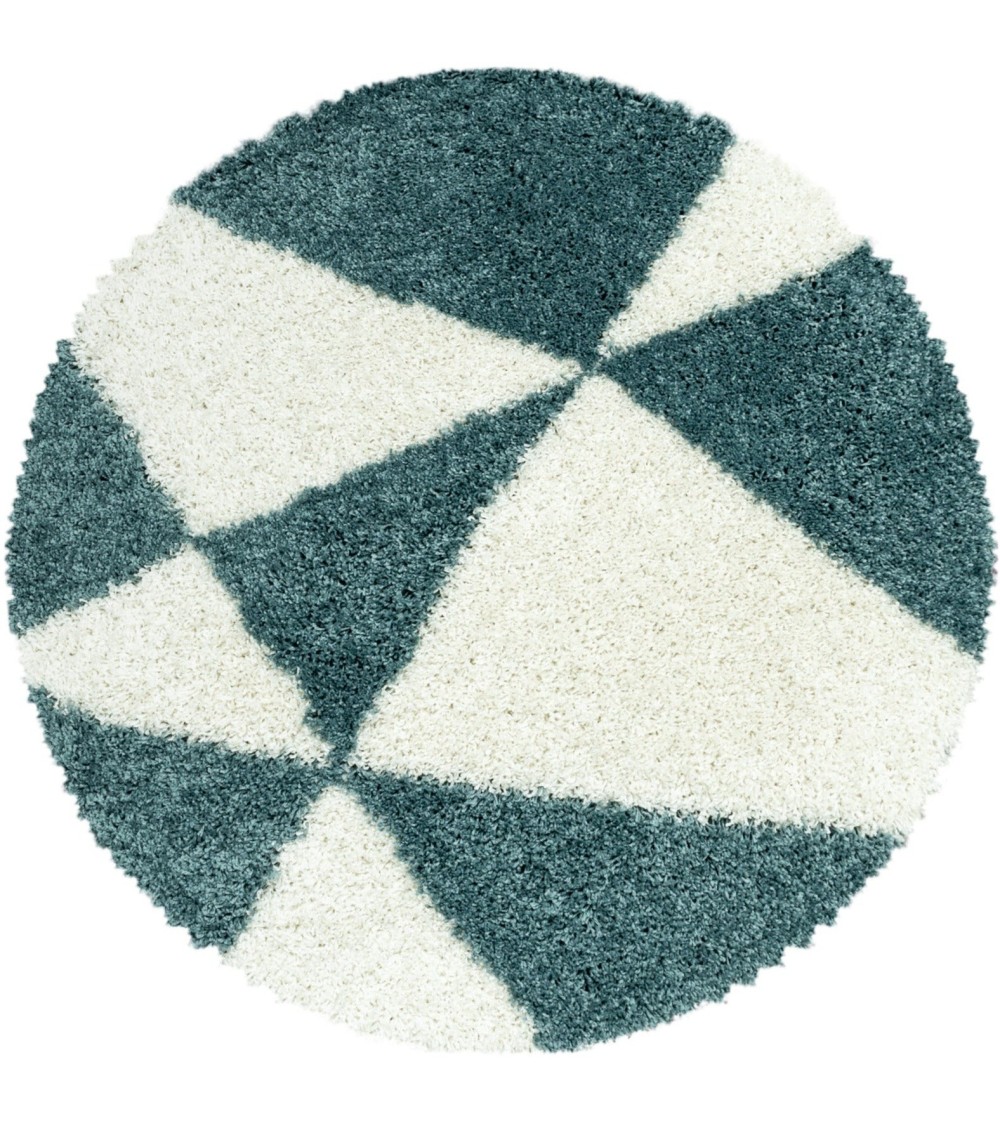 Tapis rond à poils longs géométrique turquoise et blanc 160x160cm