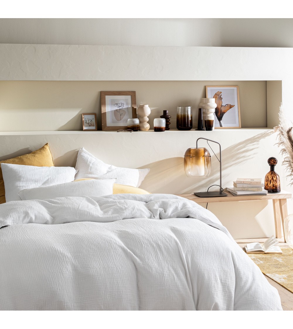 Découvrez notre collection linge de lit en gaze de coton « Simplement Gaufré », une gamme de linge de lit très facile dentretien et tendance cocooning. Pourquoi notre gaze de coton est unique ? Qualité exceptionnelle et durable : Notre gaze de coton (qualité double gaze, 155 g) a été confectionnée avec soin dans nos ateliers pour garantir la qualité dun linge de lit souple, qui ne se déforme pas et qui ne nécessite pas de repassage. Tendance : Laspect gaufré et aéré installe un style décontracté dans la chambre. Certifié OEKO-TEX® : Un label qui garantit labsence de substances toxiques et nocives pour la santé du consommateur et la protection de lenvironnement. Made in Portugal : Blanc Cerise a choisi le Portugal, réputé pour son savoir-faire dexception. Notre gaze de coton est fabriquée dans le respect des artisans et de lenvironnement. Confort : Ultra souple, notre gaze de coton assure délicatesse avec son tombé vaporeux. Housse de couette forme bouteille : Rabat qui permet de border et maintenir la couette au pied du lit. Terminé les boutons qui sarrachent au fil du temps !