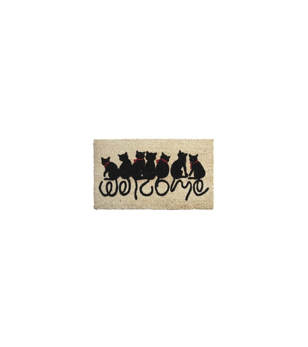 Aspect : Inscription : WelcomeMatériau principal : Coco et latex (envers)Modèle : 7 ChatsDimensions : Hauteur (en cm) : 1,50Longueur (en cm) : 75,00Profondeur (en cm) : 45,00Épaisseur (en cm) : 0,00Autres caractéristiques : Poids (en kg) : 2,80 Praticité et originalité dès le pas de la porte avec le paillasson chats Welcome en fibres de coco Dim : 75 x 45 cm Envers latexé