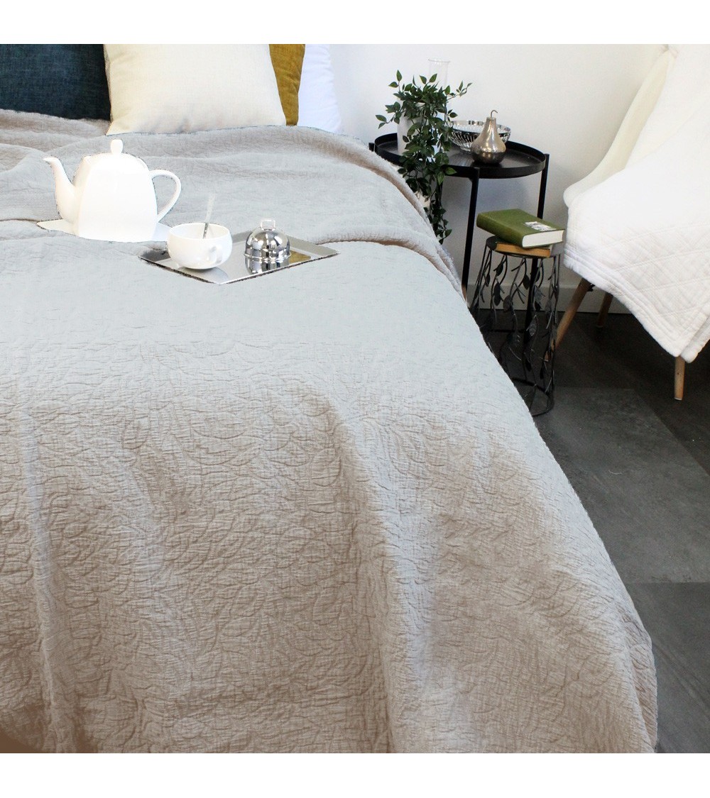 Couvre-lit 100% coton stonewash (prélavé), doux et souple. Motif végétal encadré par une bordure jacquard Matière : 100% coton. Couleur dominante : sable. Taille (largeur x longueur) : 230x250. Traitement : lavé. Type : uni. Style : Unis. Finitions : Finition coins capuchons. Grammage : 450. Entretien : Lavable à 40°C; Reportez-vous toujours à la vignette avec les instructions de lavage sur le produit.