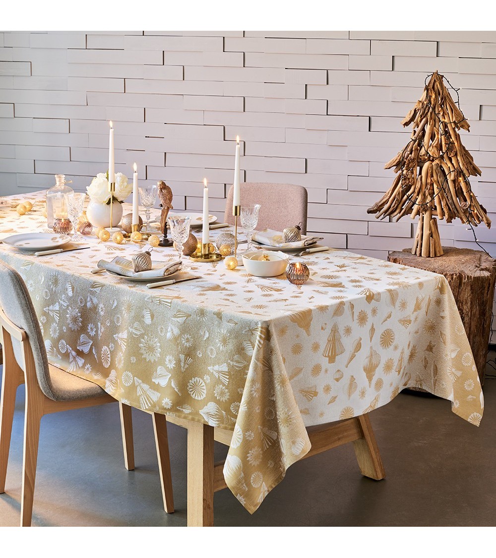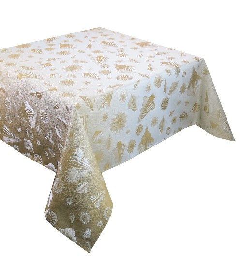 Qualité made in France. Linge des Vosges. Nappe 100% coton damassée (jacquard). Recouverte de 2 fines couches d'enduction acrylique, elle se nettoie facilement d'un simple coup d'éponge ! Egalement disponible en coton sans enduction. Matière : 100% coton peigné. Couleur dominante : or. Taille (largeur x longueur) : 150X150. Traitement : enduit imperméable. Type : jacquard. Style : Créatif. Finitions : Finition De Qualité Avec Ourlets Standards 10 Mm. Grammage : . Entretien : Pas de prélavage.En cas d'incident, intervenir rapidement sur la tache avec une éponge non abrasive mouillée d'eau chaude.Ne pas ajouter de liquide vaisselle, ni de produit d'entretien.Laver en machine exceptionnellement à 30°C avec un peu de lessive. Sans adoucissant, ni essorage.Ne pas mettre au sèche-linge.Repasser à fer chaud sur l'envers. Attention à ne pas repasser l'ourlet.Cet article est labellisé Vosges Terre Textile. Il a été tissé dans nos ateliers de Gérardmer : véritable linge fabriqué dans les Vosges !