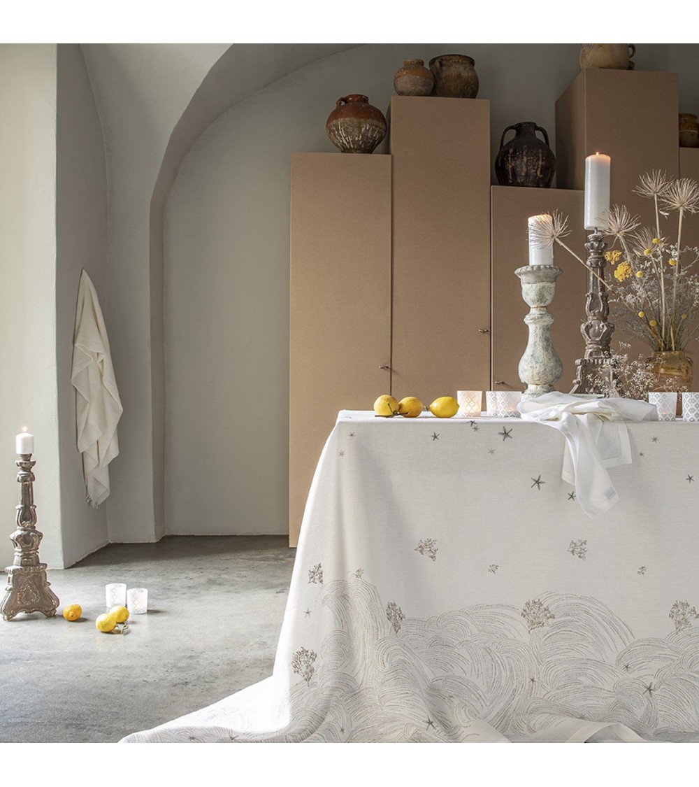 OCEANIDE cest la fusion dun dessin au grand raccord en impression numérique et dun travail raffiné de broderies en dégradés de beige et fils dor blanc. Limpression est concentrée sur les bords de la nappe et les broderies plutôt sur le centre. Une grande vague venue dun océan mythique roule des flots tumultueux sur la blancheur dune nappe en lin. Il y a de la force dans le mouvement imprimé par le graphisme pointilliste stylisé inspiré des mosaïques antiques et de la douceur dans la palette de tons neutres (gris et taupe). Une grande variété de détails et de petits motifs (branches de coraux, perles, étoiles des mers et du ciel) imprimés ou brodés contribuent à la haute valeur ajoutée de ce beau produit issu de lartisanat français. Confection parfaite, chic et sobre avec ourlets de 5cm et coins capuchon.