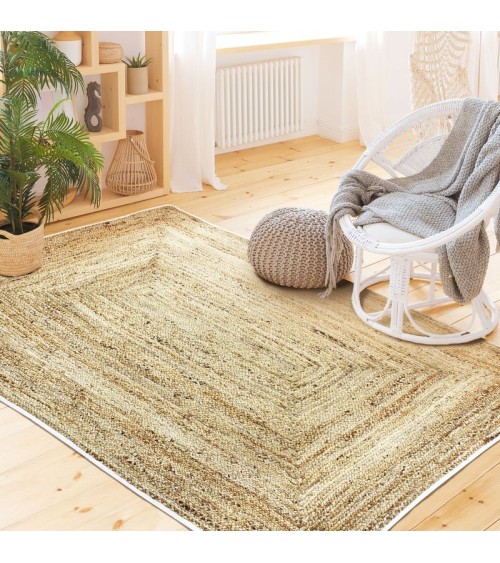 Sublime tapis tressé en jute et coton parfait pour rendre une ambiance chaleureuse et ethnique.