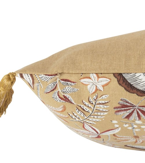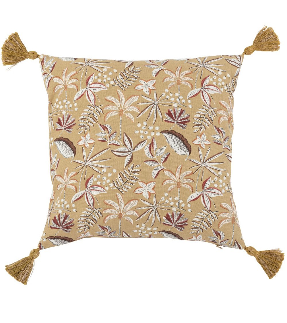 Housse de coussin en coton à pompons imprimé feuillage vert kaki 40x40