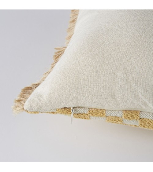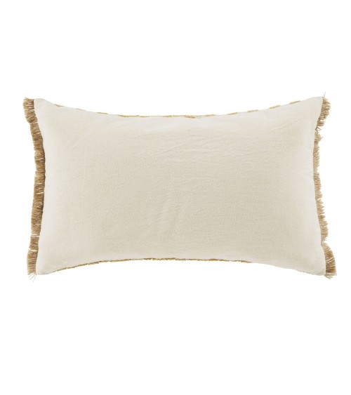Coussin en coton brodé motifs graphiques écrus et jaunes à franges 50x30