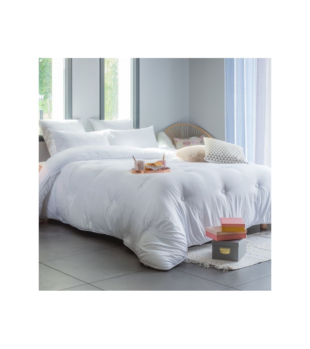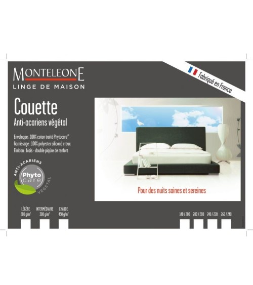 La couette PHYTOCARE vous enveloppera de douceur ! Cette couette synthétique généreuse garnissage 450 gr/m2, et son piquage capitons conservera logtemps son aspect gonflant. Son traitement phytopure à bases d'huiles essentielles vous assure une barrière efficace et naturelle contre les acariens. PHYTOCARE est une couette idéale pour l'hiver et les amoureux du cocooning !