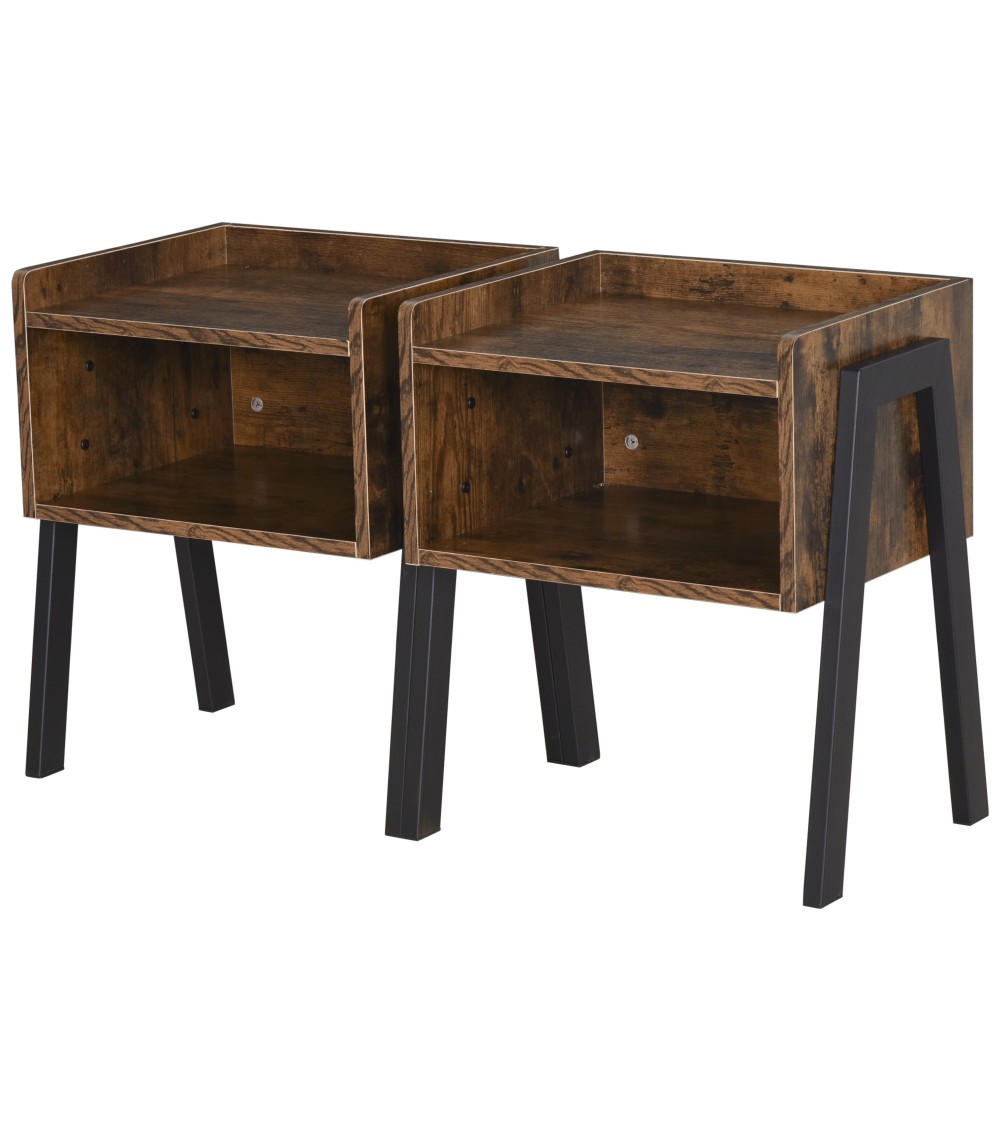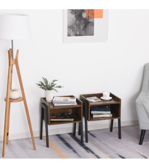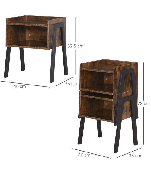 Ce lot de 2 tables de chevet est idéal pour installation dans votre chambre ou même salon ! En effet, ces 2 meubles sont polyvalents et parfaitement empilables afin de former un seul et unique meuble avec 2 niches de rangement ! Son style industriel décorera parfaitement votre intérieur en lui ajoutant une touche type loft New.yorkais.. Equipée de 2 compartiments de rangement et 2 plateaux, vous pourrez y ranger quelques affaires en toute commodité ! Caractéristiques - . Lot de 2 tables de chevet style industriel mêlant originalité et élégance idéal pour ajouter une touche type loft New.yorkais à votre intérieur. Meubles polyvalents, parfaitement empilables afin de former un seul et unique meuble avec 2 niches de rangement !. Possibilité d'utilisation en tant que tables de chevet dans votre chambre ou guéridons, tables d'appoint dans votre salon. Elégante mixité de matériaux de qualité - panneaux de particules aspect vieux bois de chêne et métal noir robuste. Nombreux espaces de rangements - niches, plateaux. Montage facile et rapide grâce au manuel d'assemblage illustré fourni Spécifications - . Couleurs principales - aspect vieux bois de chêne, métal. Matériaux principaux - panneaux de particules classe E1, métal. Dim. totales - 46l x 35P x 52,5H cm. Dim. empilées - 46l x 35P x 78H cm. Dim. plateau - 39l x 33,2P x 4H cm. Dim. niche - 39l x 33,4P x 18H cm. Dim. pieds - 2L x 4l cm. Charge max. recommandée - 50 Kg (au total), 8 Kg (par compartiment). Livraison effectuée en un colis. Réf. - 838.034