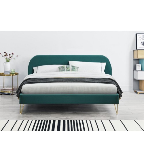 Lit 160x200 velours et pieds épingles laitonFaites de votre chambre un vrai cocon bien décoré ! Ce lit se mariera parfaitement avec une ambiance rétro.scandinave et ajoutera un certain cachet à votre pièce avec ses finitions velours vert eucalyptus et ses pieds couleur laiton !Né après.guerre et dans un objectif d'économie, le piétement en épingle permet de limiter la quantité de matériau tout en garantissant une parfaite solidité. Véritable icône du style Mid.Century, ce type de piétement revient au top de la tendance avec l'engouement du vintage ! Ses jolies courbes arrondies lui confèrent également un certain charme. Caractéristiques techniques -Couleur lit - Vert eucalyptusCouleur pieds - LaitonStructure - PlywoodPieds - 4 pieds en métal doréRevêtement - VeloursDensité - 280g/m²Matières - Polyuréthane, Plywood, MDF, MousseRangement - NonPoids maximum supporté - 180 kgLED - NonEntretien -Pour bien entretenir votre lit, utilisez un chiffon doux légèrement humide. N'utilisez pas de solvant.Dimensions - Structure de lit - 213 x 173 x 89 cm / 35,5 kgTaille du couchage - 160 x 200 cmDiagonale du couchage - 256 cmHauteur des pieds - 18 cmDimensions tête de lit - 153 x 7 x 89 cmNombre de latte - 24Poids des lattes - 5,5 kgConditionnement - Livré non monté, conditionné dans 2 cartons. Notice de montage incluse.Colis 1 - 178 x 8 x 72,5 / 14,5 kgColis 2 - 232 x 2