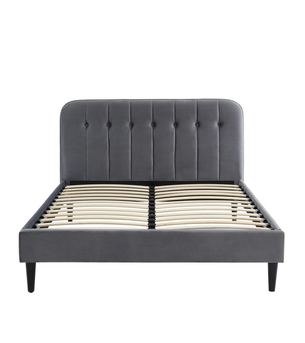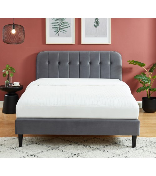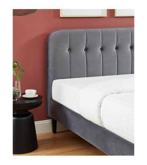 Un lit matelassé en velours Torgo total confort, amenant tout droit au pays des rêves. Ce lit Torgo 140x190cm s'allie à tous les styles grâce à son look simple et contemporain.Son plus grand atout ? Sa tête de lit matelassée en velours apportant de la douceur, tout en accentuant son look tendance. Avec ses boutons le long de la tête de lit, Torgo est la pièce sophistiquée de la chambre à coucher. Ses 4 pieds en bois massif d'une hauteur de 17cm garantissent sa stabilité et sa robustesse. À noter - Sommier inclus, matelas non inclus.