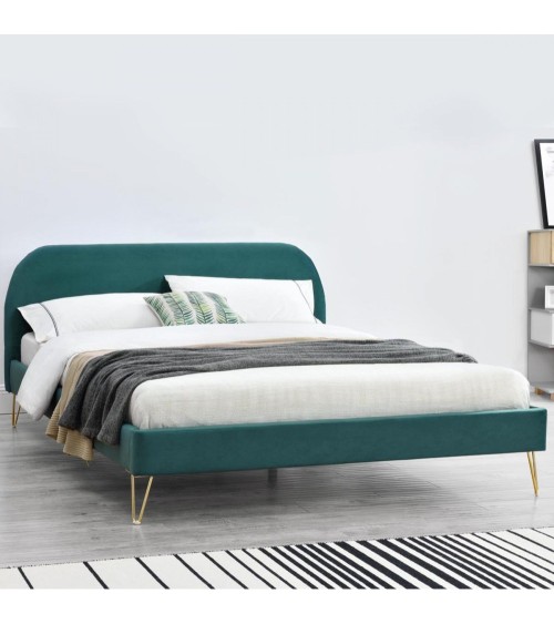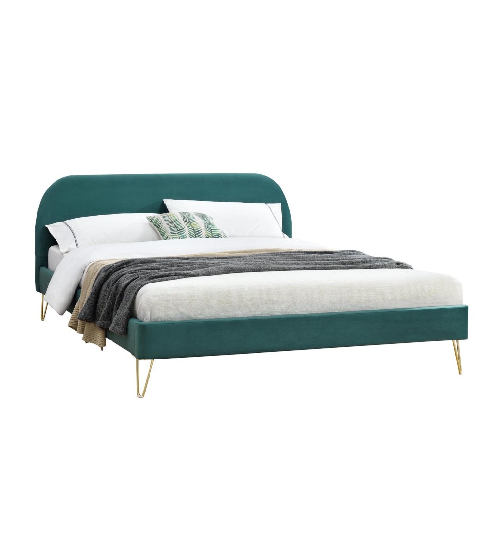 Lit 140x190 en Velours vert eucalyptus & pieds épingles LaitonAjoutez une touche de décoration à votre chambre avec ce joli lit aux lignes arrondies ! Ses finitions velours et ses pieds épingles couleur laiton le rende très tendance.Né après.guerre et dans un objectif d'économie, le piétement en épingle permet de limiter la quantité de matériau tout en garantissant une parfaite solidité. Véritable icône du style Mid.Century, ce type de piétement revient au top de la tendance avec l'engouement du vintage ! Sa couleur saura ajouter du cachet à votre nid douillet ! Caractéristiques techniques -Couleur lit - Vert eucalyptusCouleur pieds - LaitonStructure - PlywoodPieds - 4 pieds en métal doréRevêtement - VeloursDensité - 280g/m²Poids maximum supporté - 180 kgEntretien -Pour bien entretenir votre lit, utilisez un chiffon doux légèrement humide. N'utilisez pas de solvant.Dimensions -Structure de lit - 203 x 153 x 89 cm / 33 kgTaille du couchage - 140 x 190 cmDiagonale du couchage - 236 cmDimensions tête de lit - 153 x 7 x 89 cmHauteur des pieds - 18 cmNombre de latte - 24Poids des lattes - 5,5 kgConditionnement -Livré non monté, conditionné dans 2 cartons. Notice de montage incluse.Colis 1 - 158 x 8 x 72,5 / 11,5 kgColis 2 - 222 x 22 x 18 / 25 kg Livraison pas de porteGarantie 2 ans