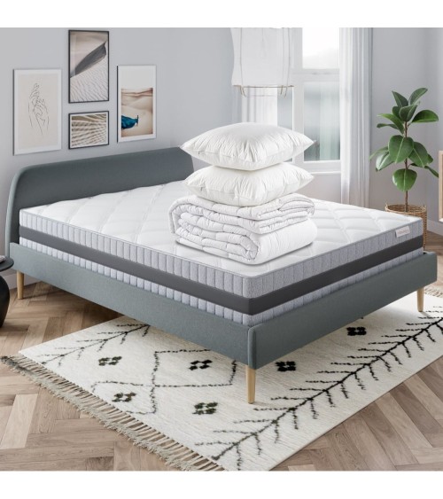 Matelas 140x190 - Mémoire de forme Visco 45kg/m3 - Mousse haute densité - Épaisseur du matelas : +/- 25 cm - Plate bande 3D fresh - Indépendance de couchage - Soutien ferme - Coutil strech luxe - Aux normes OEKO-TEX - Fabriqué en Europe - Garantie 5 ansAccessoires : - 2 oreillers 60x60 cm - 1 couette chaude - Couette de 240x220 cm - Garnissage couette : 100% polyester siliconé creux 300g/m² - Garnissage oreillers : 100% polyester siliconé creux 500g/m² - Fabrication française - Garantie 2 ans