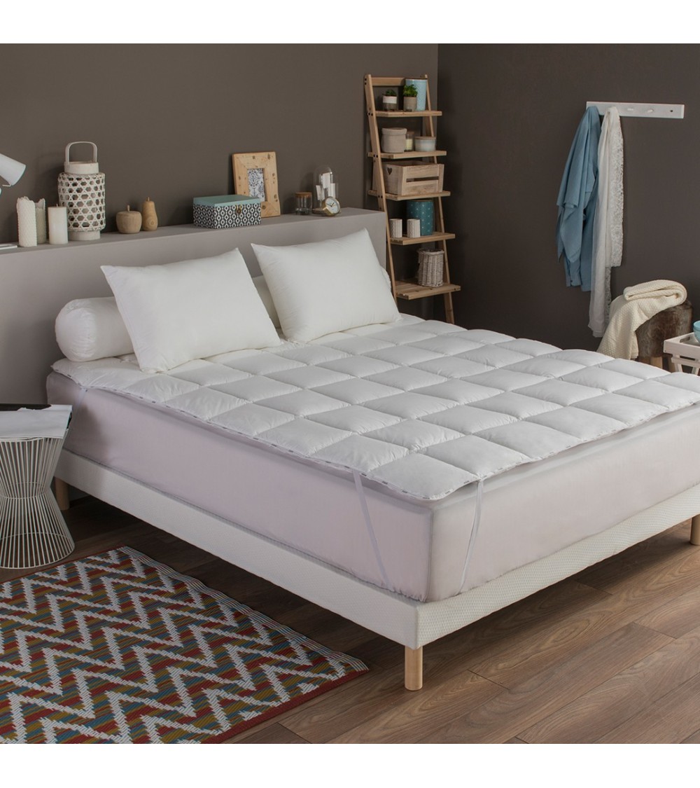 Avec le surmatelas Palace, vous dormirez comme sur un nuage et vos nuits seront dignes de celles passées dans les plus beaux hôtels. Avec le Surmatelas PALACE anti-acariens, profitez du confort des plus grands hôtels chez vous. Sa fibre FLEXCONFORT apporte plus de moelleux et de douceur à votre matelas et vous offre ainsi la sensation de dormir comme sur un nuage, pour un sommeil de qualité et un confort inégalé. Le garnissage de haute technologie de ce surmatelas permet un excellent soutien de votre corps tout au long de votre nuit de sommeil. Le piquage carreaux assure un parfait maintien de la fibre et confère un aspect haut de gamme à ce produit. Efficacement maintenu à votre matelas grâce aux 4 élastiques situés à chaque coin, ce surmatelas PALACE rendra votre literie encore plus accueillante et confortable.Le fin tissage de son enveloppe en percale de coton apportera un supplément de douceur sans faire de compromis sur la durée de vie et l'hygiène de votre surmatelas grâce à son traitement anti-acariens.Cet article traité anti-acariens contient un produit biocide. Substances actives de l'anti-acariens : extrait de margousier et géraniol. Composition du tissu : 100% coton naturel percale - Composition du garnissage : 100% polyesterLes informations environnementales de ce produit sont les suivantes : produit majoritairement recyclable, composé à minima de 0% de matières recyclées, ne comporte pas de substances dangereuses.