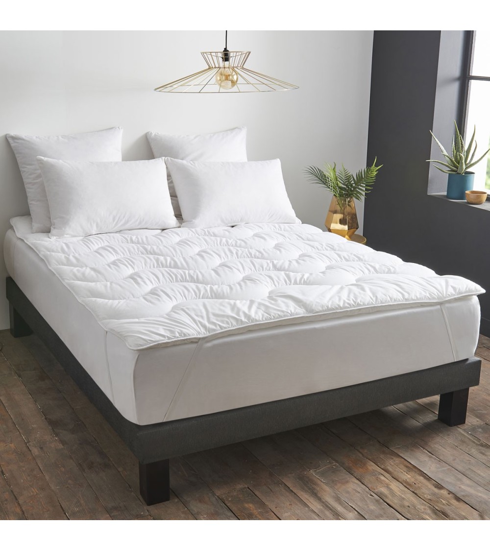 Ce surmatelas est eco-responsable : son enveloppe est en coton issu de l'agriculture biologique. Son garnissage en fibre recyclée est issu du recyclage des bouteilles en plastique. De plus, son packaging est en carton recyclé et recyclable. Confortable, son garnissage résiste aux tassements. Sa fibre apporte un gonflant inégalé. Ce surmatelas apporte un supplément de confort à votre matelas pour un effet cocon, tout en assurant un bon soutien du corps tout au long de la nuit. Il va aussi prolonger la durée de vie de votre matelas.L' enveloppe en coton biologique offre de la douceur qui procure bien-être et détente inégalés.Composition du tissu : 100% coton issu de l'agriculture biologique - Composition du garnissage : 100% fibre polyester creuse siliconée recyclée au gonflant durable