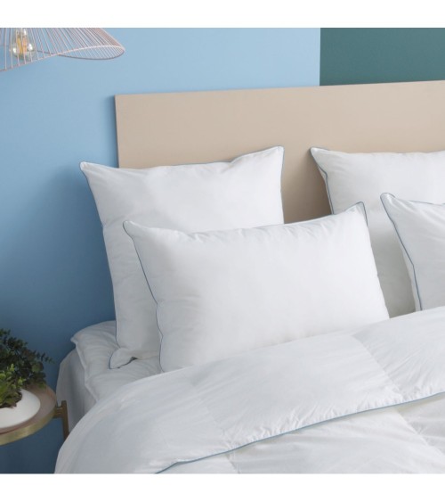 Je suis Roger.Je suis eco-responsable : mon enveloppe est en coton issu de l'agriculture biologique.Mon garnissage en fibre recyclée est issu du recyclage des bouteilles en plastique collectées par Plastic Bank ® qui préserve les océans.Mon packaging est en carton recyclé et recyclable. Je suis confortable : mon garnissage offre un confort ferme particulièrement adapté aux personnes qui dorment sur le ventre. La technique de fabrication de la fibre soufflée apporte encore plus de douceur et de gonflant à l'oreiller. Mon enveloppe en coton naturel offre beaucoup de douceur.Je suis aussi beau à l'intérieur qu'à l'extérieur avec ma finition passepoil bleu denim.
