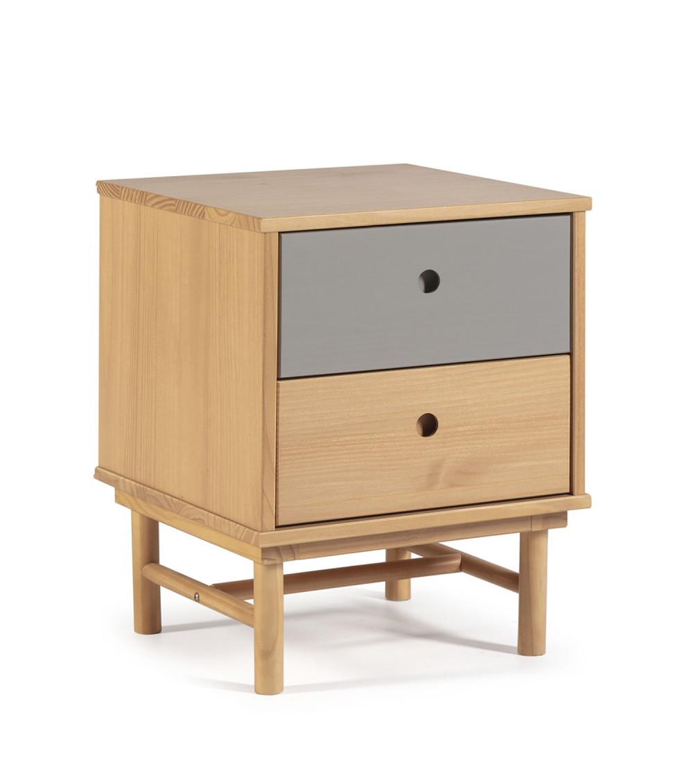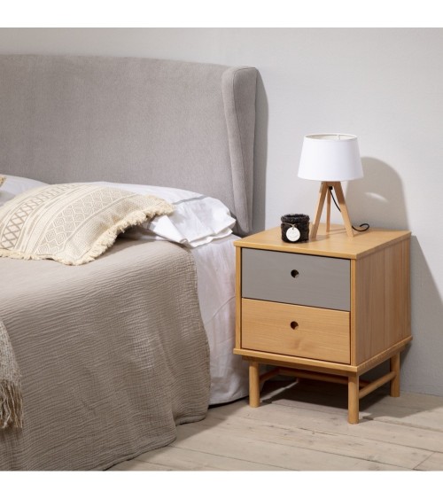 Table de chevet 2 tiroirs couleur bois et gris, bois massif