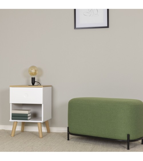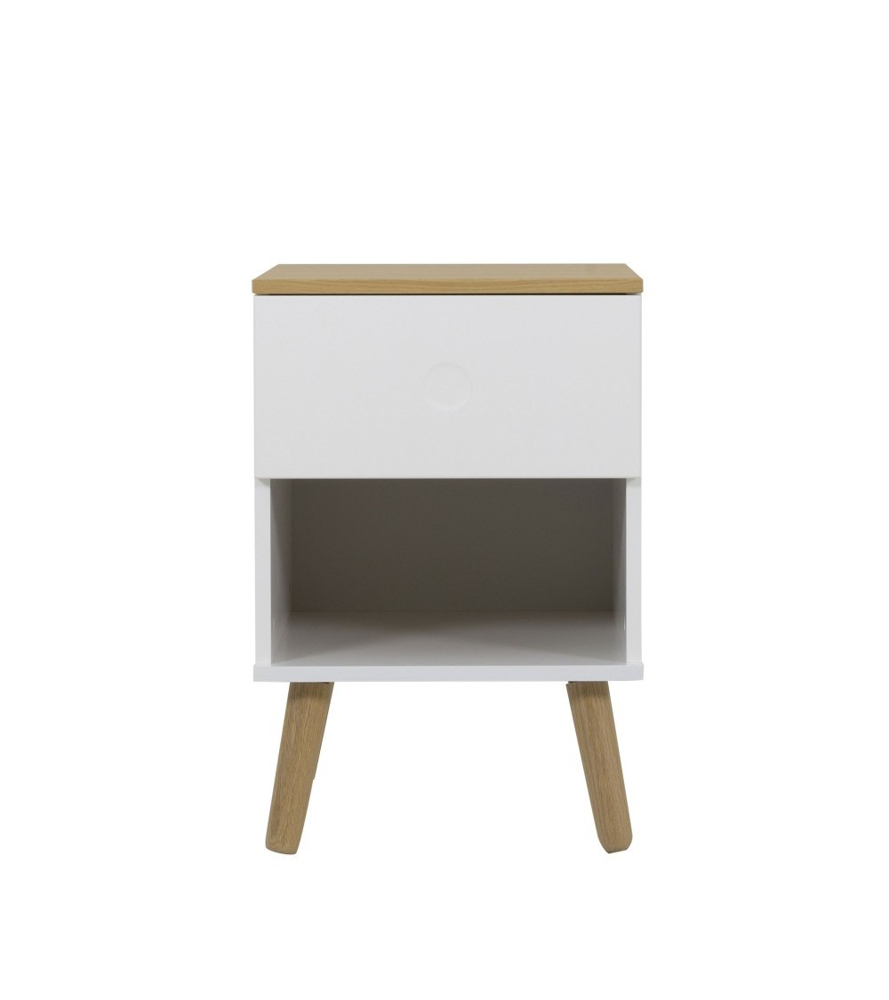 Impossible de résister au charme de ce petit meuble ! La table de chevet en bois 1 tiroir de la collection Dot attire l'oeil par son allure scandinave, ses lignes épurées et son design minimaliste. Ses 4 pieds en chêne massif évasés lui confèrent un style vintage élégant. Et pour parfaire son look, ce meuble Tenzo est agrémenté d'une façade en bois MDF blanche, grise claire ou vert d'eau. L'association de ces couleurs douces avec le bois se fait de manière équilibrée afin de mettre l'accent sur la conception raffinée du modèle. Ces teintes peuvent se combiner facilement à d'autres couleurs pour créer une décoration personnalisée de la chambre. Cette table de chevet nous séduit également par son aspect pratique. Elle présente en effet une niche sous le tiroir et peut donc accueillir des livres ou d'autres effets personnels qu'on aime garder près de soi.La table de chevet en bois 1 tiroir Dot vous simplifie la vie tout en étant facile à entretenir : un nettoyage avec un chiffon doux sec ou légèrement humide suffit pour qu'elle retrouve son éclat.Pour rester dans l'esprit minimaliste jusque dans les moindres détails, le tiroir comporte un patin avec poussoir, si bien que la présence d'une poignée est inutile. Il suffit donc d'une simple pression pour ouvrir le tiroir dont le poids maximal supporté est de 5 kg. La protection anti-basculement est un petit plus non négligeable pour assurer la longévité du meuble.