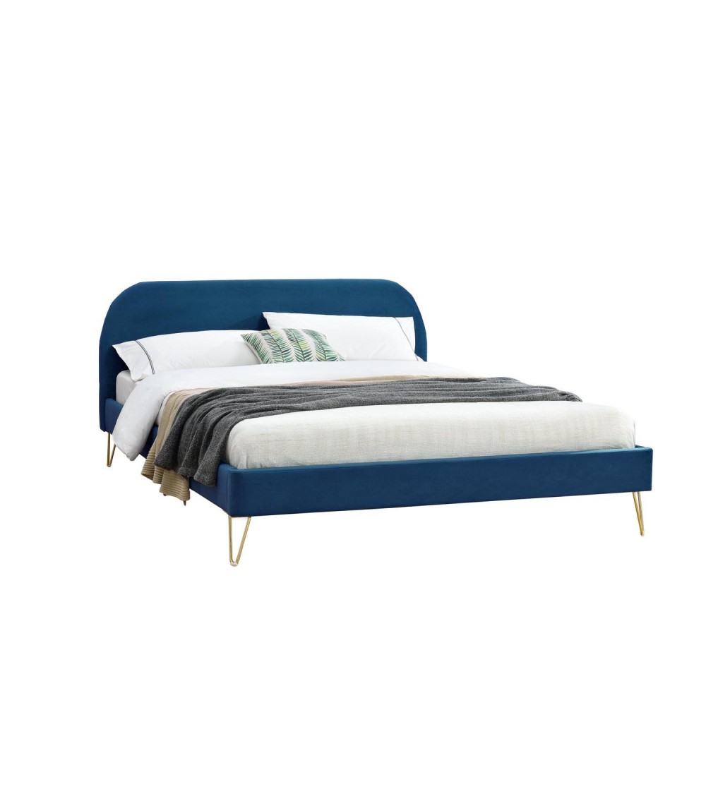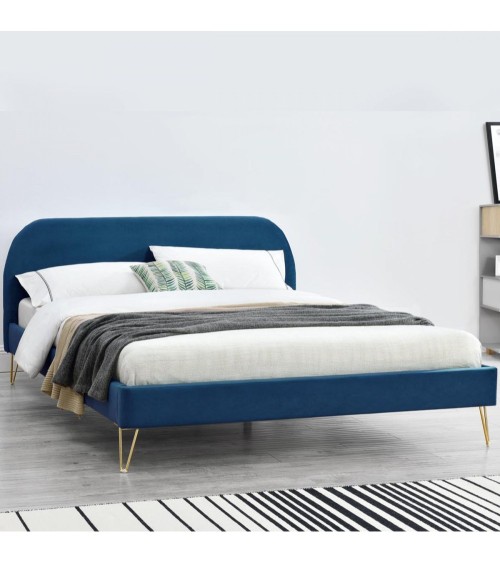 Lit 140x190 velours bleu et pieds épingles laitonCraquez pour ce lit aux jolis courbes et aux finitions velours ! Ses pieds couleur laiton et sa couleur bleu foncé lui donne un certain cachet.Le piétement en épingle, né en 1941, permet de limiter la quantité de matériau tout en garantissant une parfaite solidité. Véritable icône du style Mid-Century, ce type de piétement revient au top de la tendance avec l'engouement du vintage ! Il s'intégrera parfaitement à une chambre à la décoration rétro-scandinave ou industrielle ! Caractéristiques techniques :Couleur lit : Bleu foncéCouleur pieds : LaitonStructure : PlywoodPieds : 4 pieds en métal doréRevêtement : VeloursDensité : 280g/m²Matières : Polyuréthane, Plywood, MDF, MousseRangement : NonPoids maximum supporté : 180 kgLED : NonEntretien :Pour bien entretenir votre lit, utilisez un chiffon doux légèrement humide. N'utilisez pas de solvant.Dimensions : Structure de lit : 203 x 153 x 89 cm / 33 kgTaille du couchage : 140 x 190 cmHauteur des pieds : 18 cmDiagonale du couchage : 236 cmDimensions tête de lit : 153 x 7 x 89 cmNombre de latte : 24Poids des lattes : 5,5 kgConditionnement : Livré non monté, conditionné dans 2 cartons. Notice de montage incluse.Colis 1 : 158 x 8 x 72,5 / 11,5 kgColis 2 : 222 x 22 x 18 / 25 kg Livraison pas de porteGarantie 2 ans