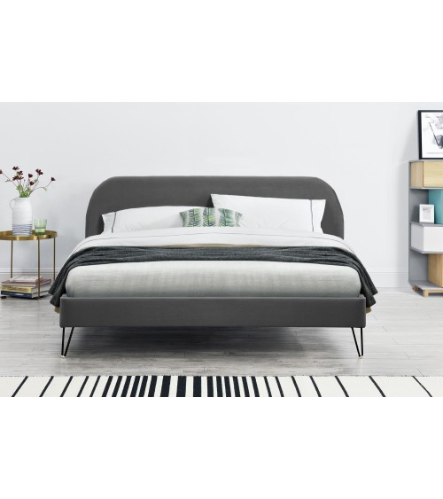 Lit 160x200 velours gris et pieds épingles noirsOffrez-vous ce grand lit Phoenix Queen size et faites de votre chambre un véritable cocon ! Son revêtement en velours gris et ses pieds épingles en métal noir lui donnent une certaine élégance. Le piétement en épingle, né en 1941, permet de limiter la quantité de matériau tout en garantissant une parfaite solidité. Véritable icône du style Mid-Century, ce type de piétement revient au top de la tendance avec l'engouement du vintage ! Ses tons sobres lui permettront de s'intégrer parfaitement à votre chambre. Caractéristiques techniques :Couleur lit : GrisCouleur pieds : NoirStructure : PlywoodPieds : 4 pieds en métal noirRevêtement : VeloursDensité : 280g/m²Matières : Polyuréthane, Plywood, MDF, MousseRangement : NonLED : NonPoids maximum supporté : 180 kgEntretien :Pour bien entretenir votre lit, utilisez un chiffon doux légèrement humide. N'utilisez pas de solvant.Dimensions :Structure de lit : 213 x 173 x 89 cm / 35,5 kgTaille du couchage : 160 x 200 cmDiagonale du couchage : 256 cmHauteur des pieds : 18 cmDimensions tête de lit : 153 x 7 x 89 cmNombre de latte : 24Poids des lattes : 5,5 kgConditionnement :Livré non monté, conditionné dans 2 cartons. Notice de montage incluse.Colis 1 : 178 x 8 x 72,5 / 14,5 kgColis 2 : 232 x 22 x 18 / 26,5 kg Livraison pas de porteGarantie 2 ans