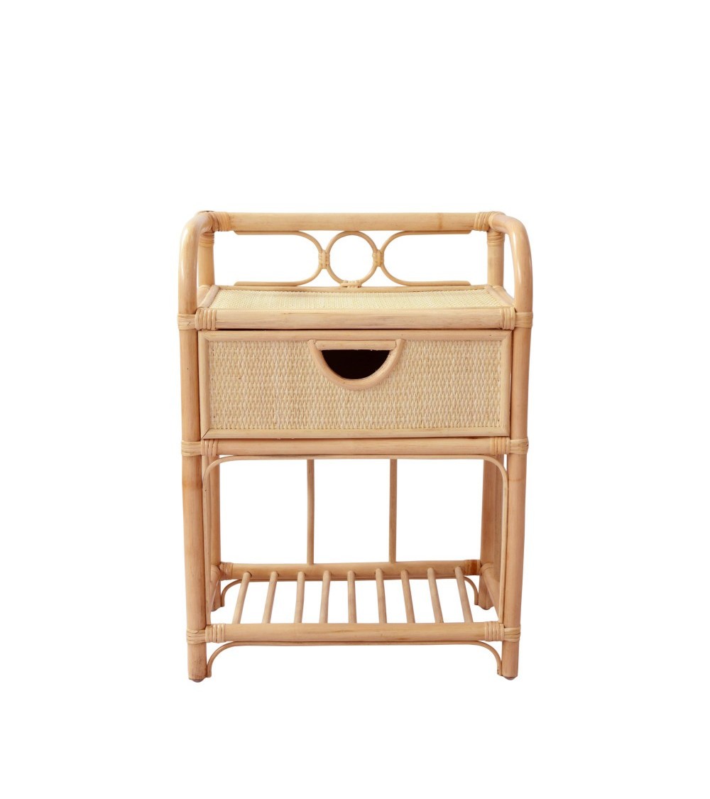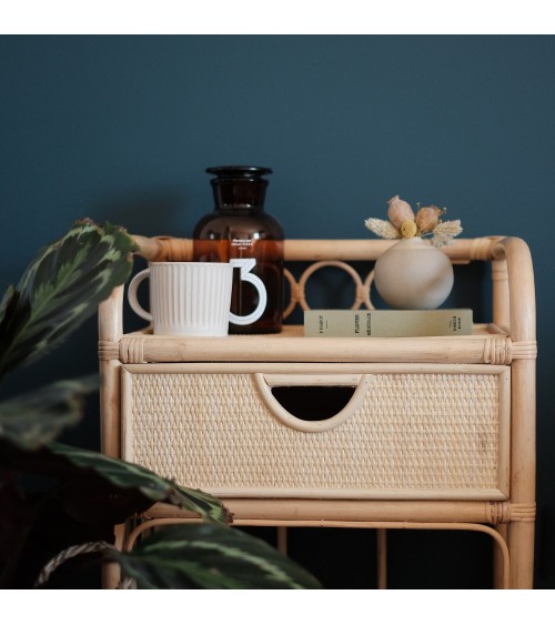 Avec son design d'inspiration bohème qui nous rappelle le mobilier des années 60-70, cette table de chevet en rotin Tondano va se faire une place de choix dans la chambre !Avec sa petite touche rétro, elle habille à merveille le côté du lit, que la chambre soit plutôt vintage ou 100% tropicale. On peut aussi jouer le total look rotin, avec une tête de lit Sangaraja par exemple !Jolie mais pas seulement, elle est constituée de 2 étagères, dont une supérieure en rotin tressé artisanalement. Pratique : on peut y ranger une multitude de petites affaires ! En haut, la fameuse lampe de chevet et les bijoux avec lesquels on ne dort pas. En bas, notre pile de bouquins préférés du moment. Et au milieu, dans son tiroir, toutes les affaires qu'on ne souhaite pas montrer à tout le mondeHauteur de la tablette : 51cm