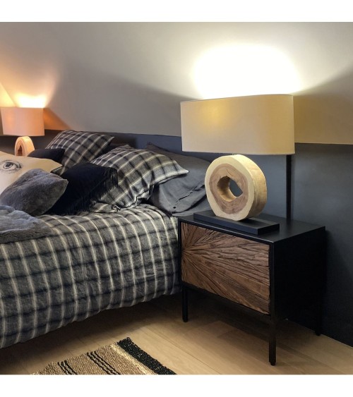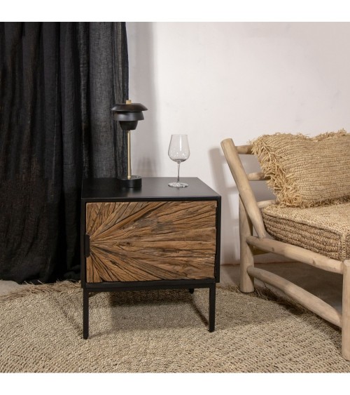 Vous accordez à votre chambre à coucher un soin tout particulier en matière de déco ? Alors, véritable invitation à la rêverie et au voyage, notre table de chevet SARMATY en bois de teck massif 100% recyclé et métal vintage aspect vieilli noir vous fera craquer. Elle vous séduira par son allure discrète et son look minimaliste. Table de chevet en métal vintage aspect vieilli noir et porte en bois de teck massif 100 % recyclé Dimensions du chevet : 50 x 40 x 50 cm Hauteur des pieds : 18 cm Poids : 16.000 kgs Utiliser un chiffon humide