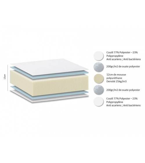 Matelas 100 % mousse polyuréthane. FERME Epaisseur : 14 cm Ame : 12 cm 100 % mousse polyuréthane 25 kg/m3. Face hiver : 200 g/m2 ouate hypoallergénique.Face été : 200 g/m2 ouate hypoallergénique.Fermeté : Ferme.Accueil : Tonique.Coutil : accueil écru 60 % polypropylène 40 % polyester traité anti-acariens et anti-bactériens. Piquage : petite étoile. Garantie 5 ans.Fabrication 100% Française.