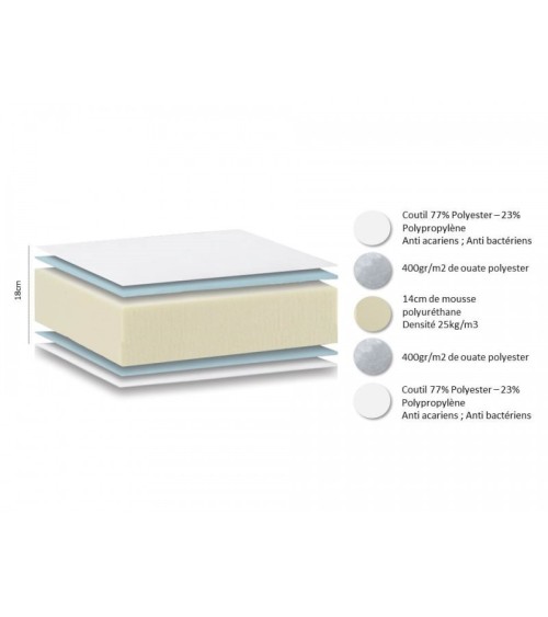 Matelas mousse FERME Vega Epaisseur : 16 cm Mousse : 100 % Mousse polyuréthane.Ame : 14 cm Densité : 25 kg/m3 Face hiver : 5 mm de mousse + 200 g/m2 ouate hypoallergénique.Face été : 5 mm de mousse + 200 g/m2 ouate hypoallergénique.Fermeté : Ferme Accueil : Tonique Coutil : TIBO 75 % polyester 25 % polypropylène, traité anti-acariens et anti-bactériens, 4 poignées. Garantie 5 ans.Fabrication 100% Française.