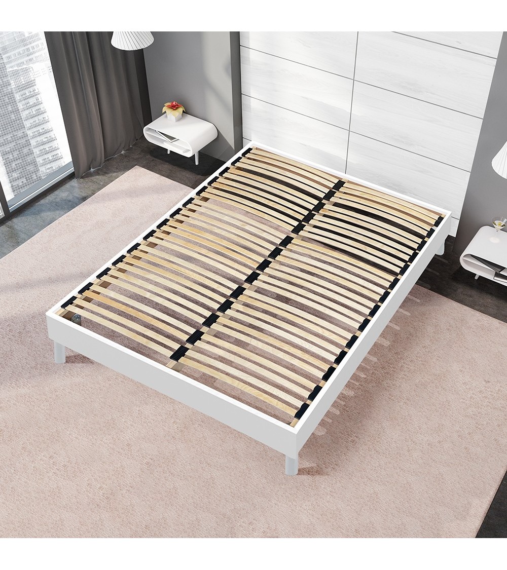 « Produit à usage professionnel et particulier »Ce sommier en bois à Lattes ''Made in France'' s'adaptera dans tous types d'intérieurs. Il se marie dans tous types de pièces grâce à son coloris blanc tendance. Doté d'une structure robuste et rigide, celui-ci est renforcé par un renfort transversal. Une poutre centrale est fixée au cadre avec des équerres métalliques. Le sommier dispose de 4 zones de confort : épaule, torse, lombaire et bassin. Il a été conçu en bi-lattes de façon à vous apporter flexibilité et confort de couchage. Les embouts des lattes reposent sur un tasseau fixé au cadre et sont insérés sur le côté pour éviter toute possibilité d'arrachement. La densité élevée de 26 lattes et 28 lattes par couchage permet d'utiliser ce sommier pour tous les types de matelas.. Nos matelas et nos sommiers sont soumis à une réglementation stricte. Afin de respecter la norme AFNOR, ceux-ci peuvent varier en longueur (entre 10 à 40 mm) et en largeur (entre 5 à 20 mm), pour qu'ils puissent entrer dans des cadres de lit, qui sont eux-mêmes côtés de façon normée. Ex : un achat en 140 x 190 cm peut mesurer 138 x 188 cm. Cette norme est obligatoire pour tous les fabricants de literie.