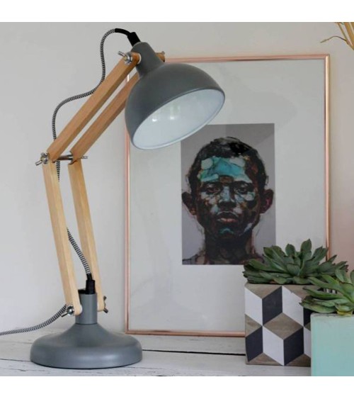 Lampe de table Gris mat et Bois En métal et Bois Largeur 15 cm . Hauteur 42 cm Fonctionne sur secteur, prise Européenne Ampoule E14, max 15 Watts Ampoule non Incluse