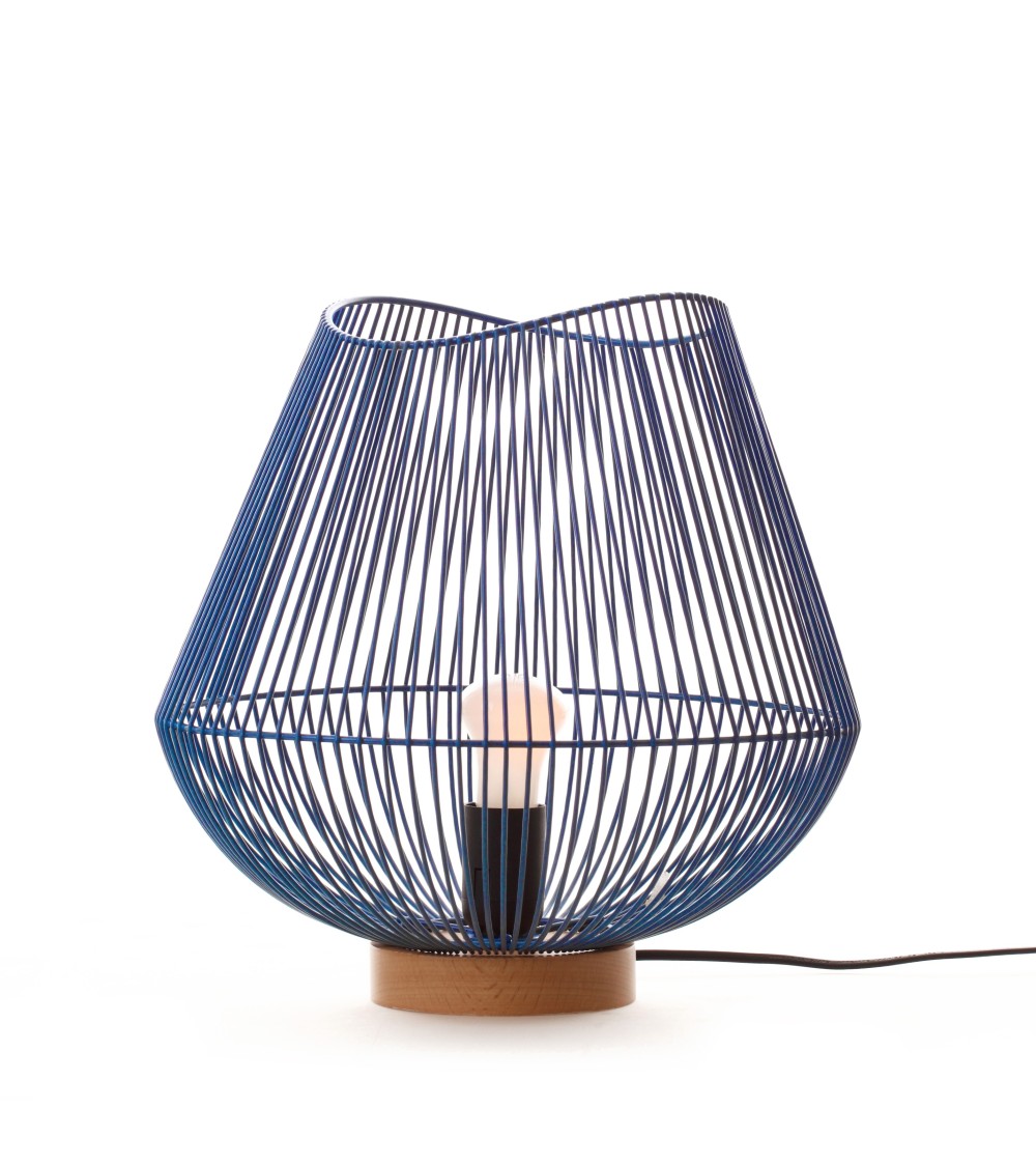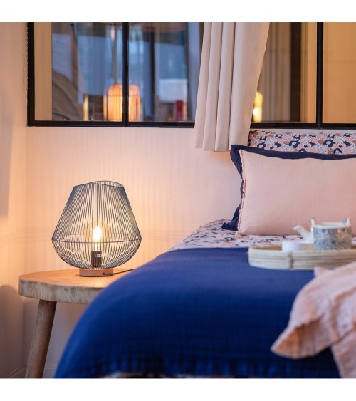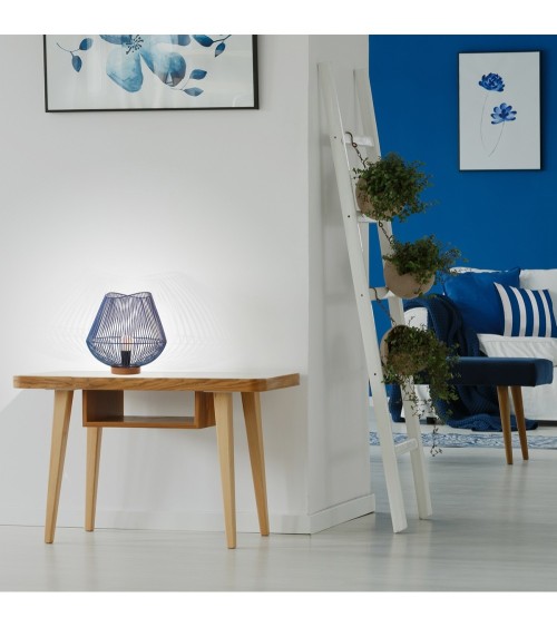 Une petite lampe filaire aux effets lumineux exquis, ça vous tente ? Avec son look totalement épuré, simplement composé de fils métalliques bleus foncés et d'un socle en bois de hêtre, notre lampe GROOVE va twister votre déco avec beaucoup de charme. Avec son design wavy tout en rondeurs et ses 32 cm de diamètre, elle émet une lumière chaleureuse très agréable. Cette lampe à poser est compatible avec une ampoule E27 de 40 watts. Existe aussi en coloris céladon et blanc et en suspensions. Interrupteur sur câble. Les plus du produit - Matériau résistant . Effets lumineux . Ampoule à personnaliser Caractéristiques - . Douille - E27 . Puissance - 40W . IP - 20 . Matière - metal