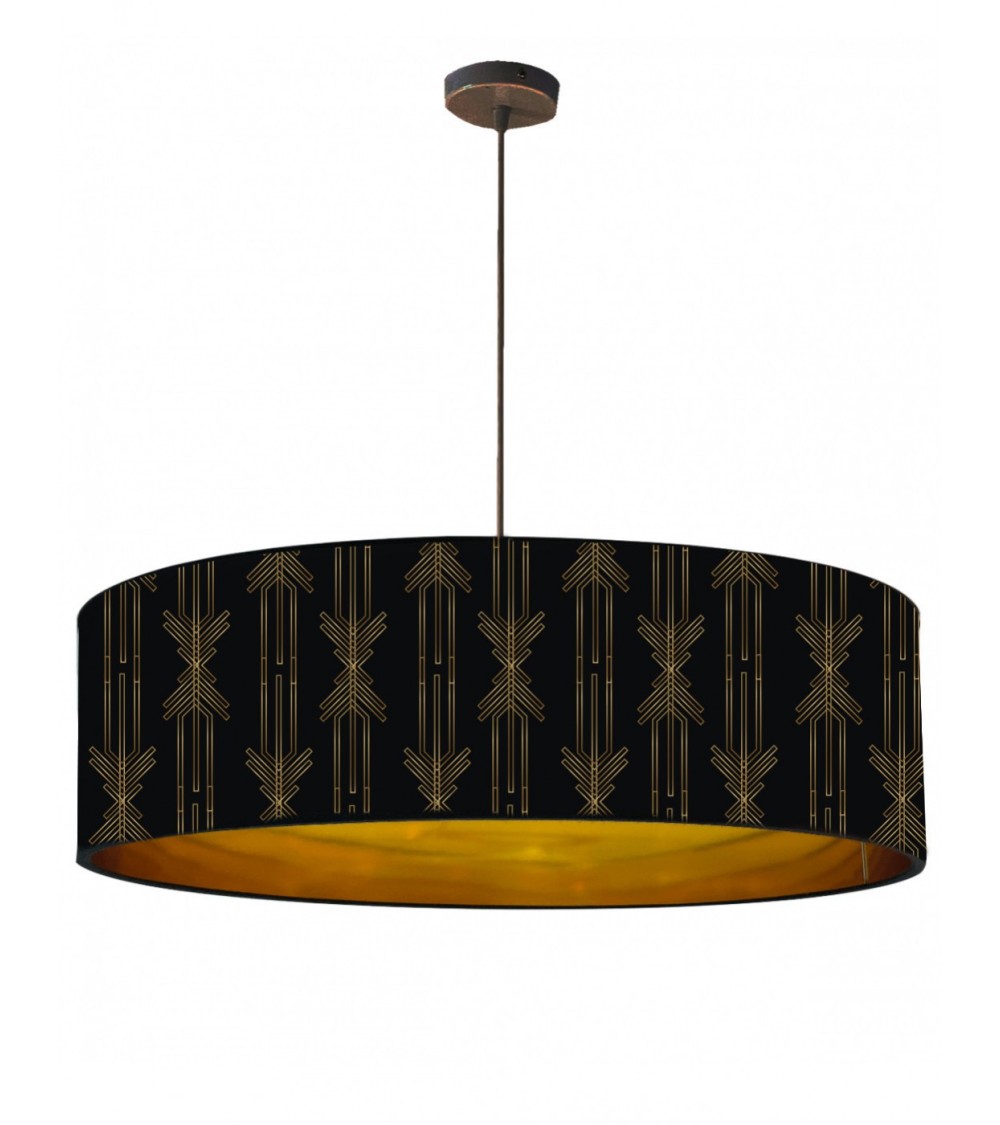 Produits à usage professionnels et particuliers. La Suspension de la gamme Goldy est fabriquée en PVC laqué intérieur et extérieur de couleur or. Cette suspension est imprimée d'un motif noir sur fond de PVC or laqué, lui donnant un aspect moderne et élégant. De plus, lorsqu'elle est allumée, la suspension renvoie une lumière métallisée très tendance qui se marie parfaitement aux motifs dorés. Cette suspension est idéale pour un éclairage d'ambiance et conviendra parfaitement pour être installée en décoration au.dessus d'une table, dans une cuisine ou dans un salon. Elle mesure 65 cm de diamètre et 28 cm de hauteur et est fournie avec une platine de plafond, un câble de 80 cm et une douille E27. Elle nécessite une ampoule LED avec un culot E27 et est destinée à un usage intérieur uniquement.