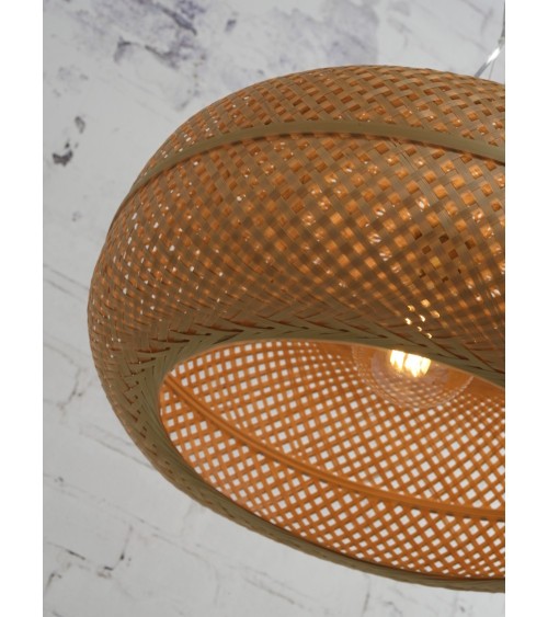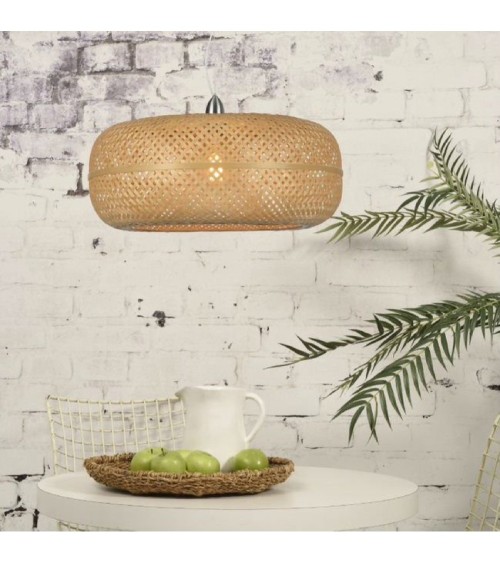 Suspension de la collection Palawan éditée par Good & Mojo composée d'une rosace de plafond métallique, d'un cordon d'alimentation et d'un câble d'élingue supportant un abat.jour cylindrique réalisé en fibres de bambou tressées.Une lampe résolument design et responsable qui agrémentera votre interieur d'une lumière douce et tamisée.Les luminaires Good & Mojo sont issus du commerce équitable. Pour tout achat d'un luminaire, la marque propose l'opération - une lampe achetée, un arbre planté et 5 pour cent du prix du luminaire est reversé à l'association Waka Waka qui fournit des lampes solaires aux populations n'ayant pas accès à l'électricité.Ampoule - 1x60W E27 (non fournie).