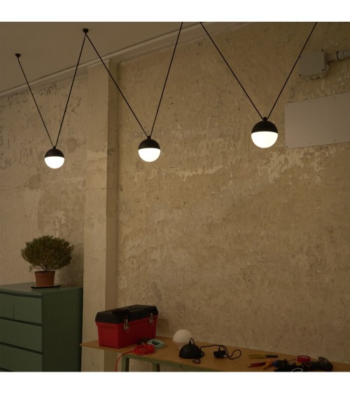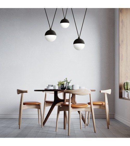Suspension avec 3 sphères en béton noir et verre opale. Le béton est devenu l'un des matériaux les plus en vogue pour la décoration intérieure. Cette pièce est composée de 3 sphères suspendues avec une finition polie impeccable et élégante, idéale pour donner de la personnalité à n'importe quelle pièce. Il utilise une douille E27 et un câble en nylon noir. Il dispose de crochets pour le plafond avec lesquels vous pouvez jouer avec différentes hauteurs et formes. Laissez les phases ECLIPSE illuminer votre maison.