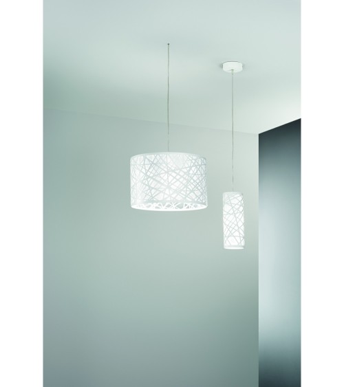 Dans un style graphique simple et discret, la suspension cylindrique BATIK affiche une teinte blanche symbole de pureté et de ressourcement. Son abat.jour cylindrique de 35 cm de diamètre présente un design géométrique aux lignes droites qui s'entrecoupent. Cet abat.jour suspendu aux accents à la fois ethniques et scandinaves est doublé d'une texture blanche en transparence qui joue les diffuseurs en filtrant le flux lumineux pour générer un éclairage chaleureux et homogène non éblouissant. Cette jolie suspension viendra éclairer une pièce à vivre en toute simplicité - salon, entrée et chambre l'adoptent très facilement. Ce luminaire est compatible avec une ampoule E27 d'une puissance de 42 watts (ampoule non incluse). Dimensions - hauteur 125cm (hauteur réglable) x diamètre 35cm. Existe également dans la même série BATIK en suspension barre 3 lumières, suspension tube, applique, lampadaire et lampe à poser. Les plus du produit - Eclairage homogène . Entretien facile . Effets lumineux Caractéristiques - . Douille - E27 . Puissance - 42W . IP - 20 . Matière - metal
