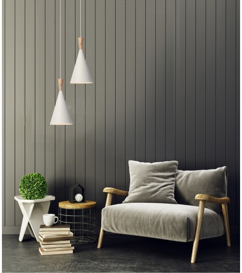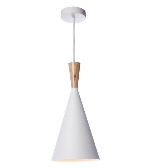 Une suspension de style scandinave, en métal blanc réhaussé d'une pièce de bois clair, pour un éclairage en toute simplicité. Plafonnier métal blanc, câble plastique blanc. Voir également le modèle BIRGIT.
